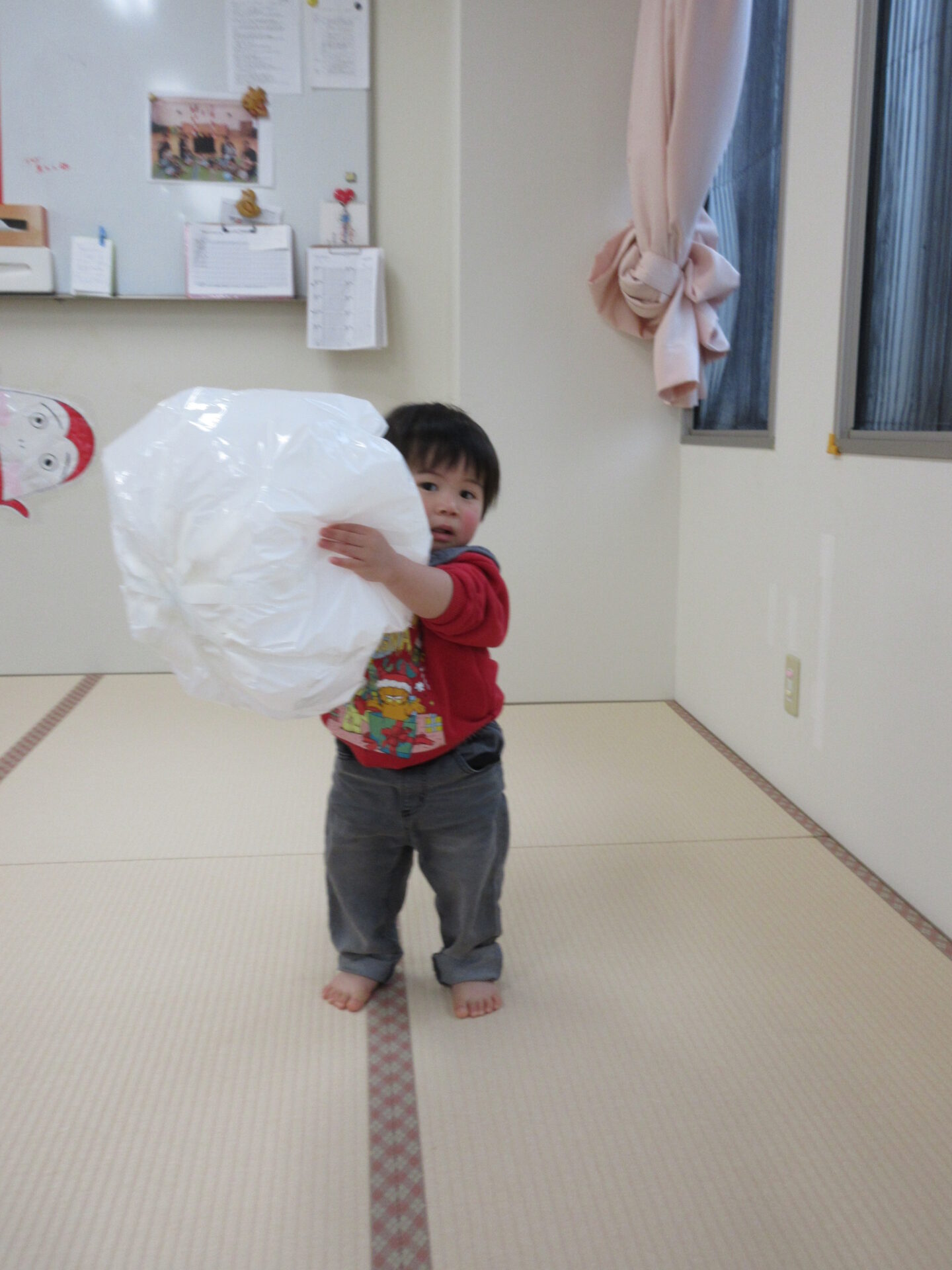 ビニール袋を膨らませて雪だるまに見立てて遊びました⛄