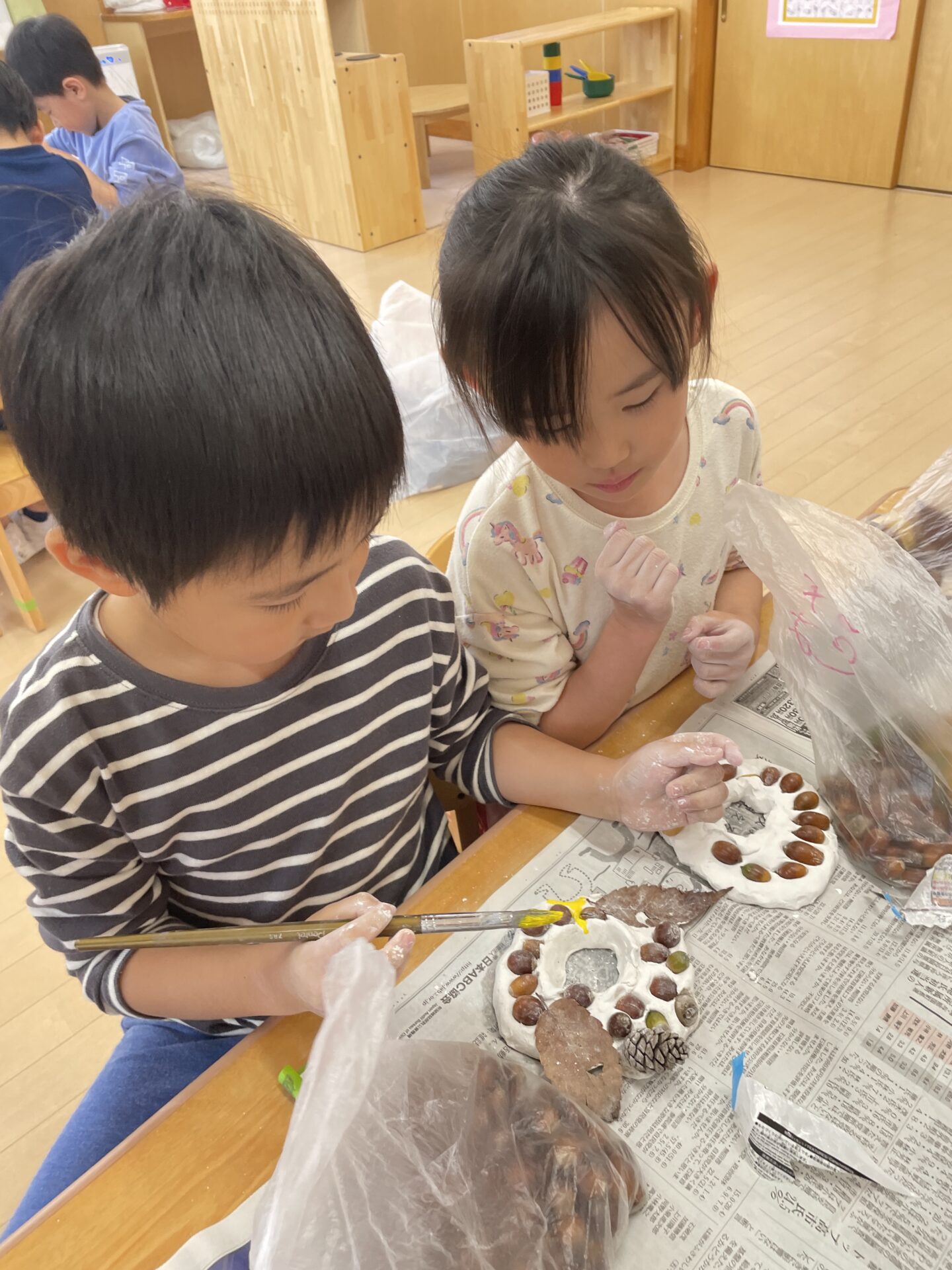 この日は、お散歩で拾ってきたどんぐりを使ってクリスマスリース作りをしました! まずは…
