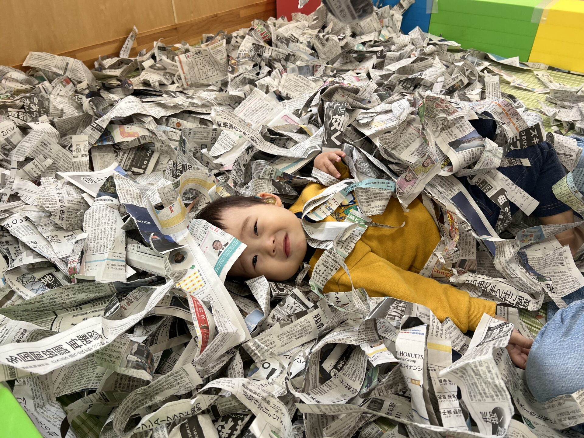 今回の園開放は、たくさんの新聞遊び♪ 新聞に埋もれ気持ちよさそう♡ 吊るしてある新…