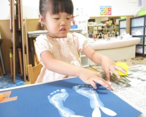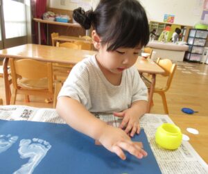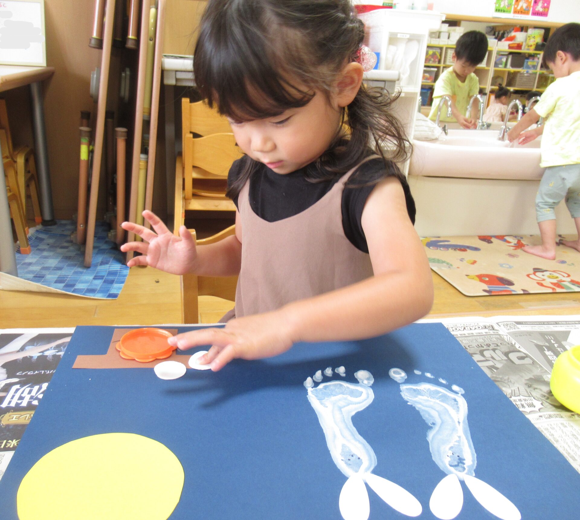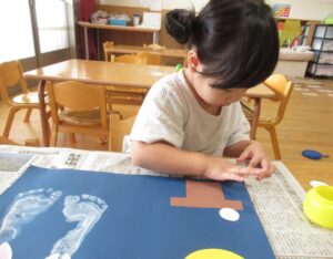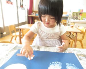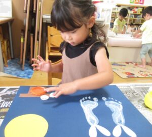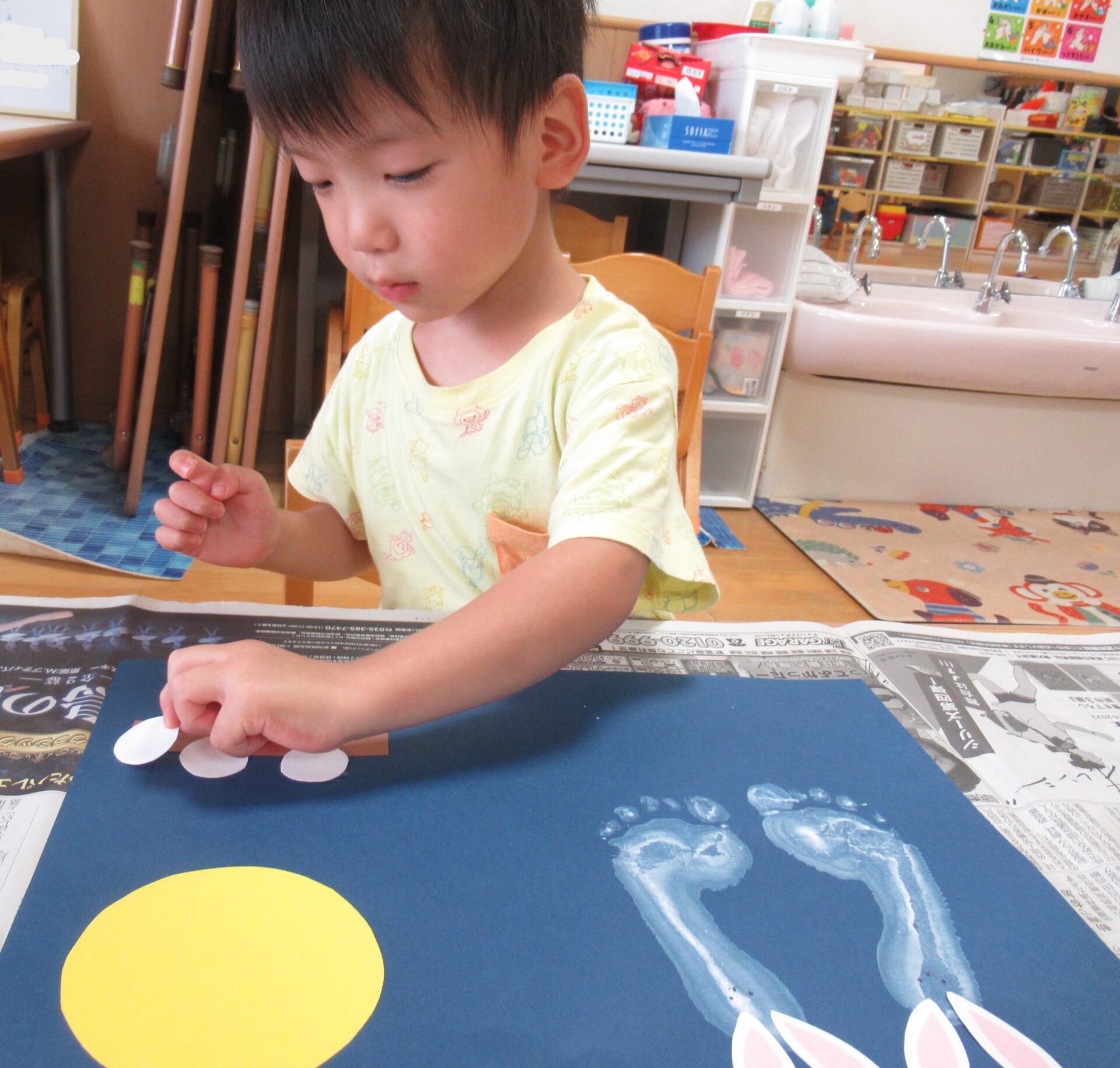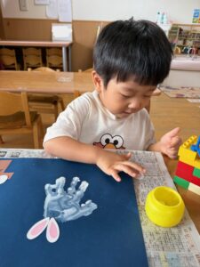 白い絵具で足型をとり、可愛いウサギを作り…🐰🌙(まだまだ小さい足型が可愛いです💓)