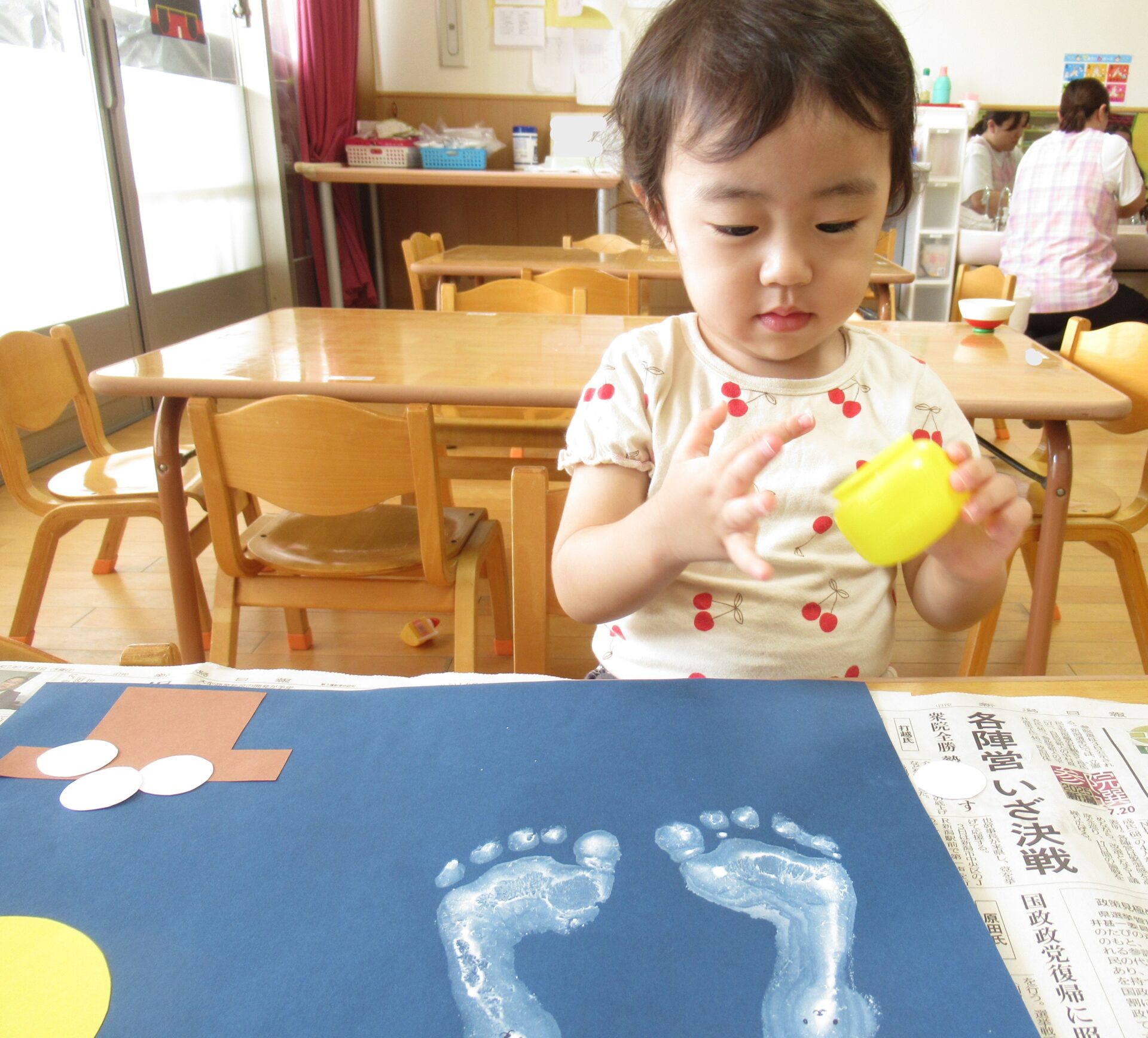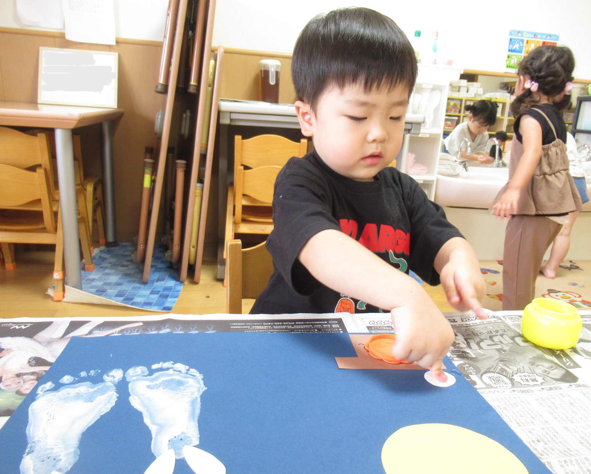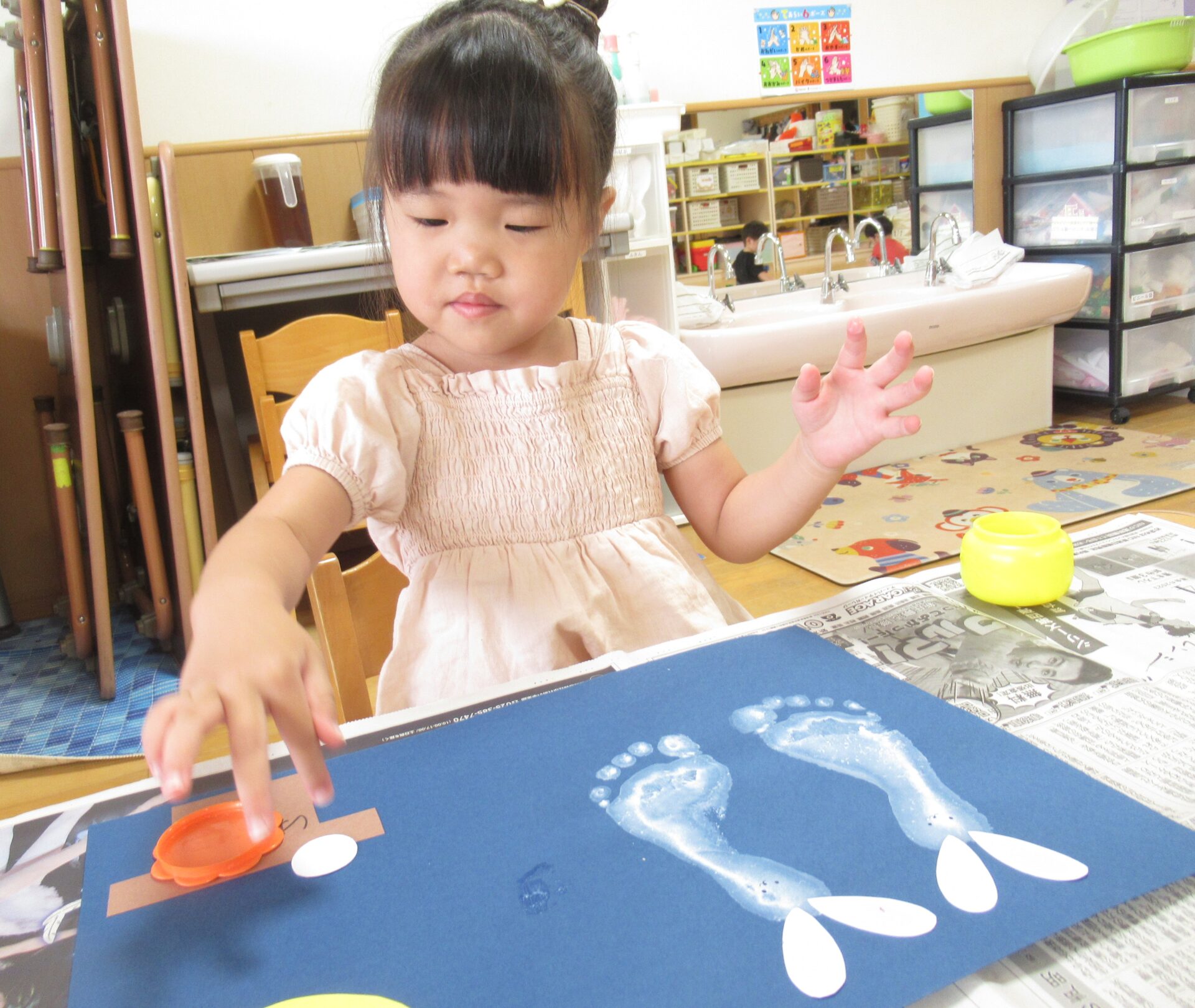 白い絵具で足型をとり、可愛いウサギを作り…🐰🌙(まだまだ小さい足型が可愛いです💓)
