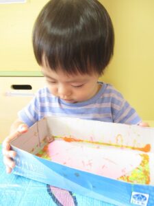箱の中でビー玉を転がすと、絵の具がついて