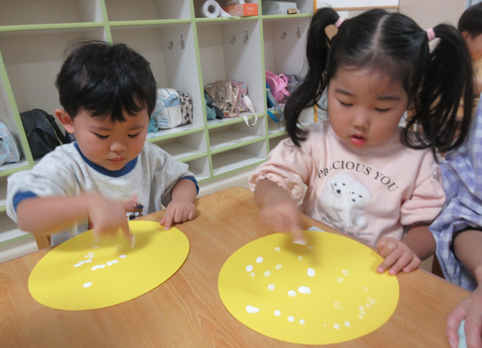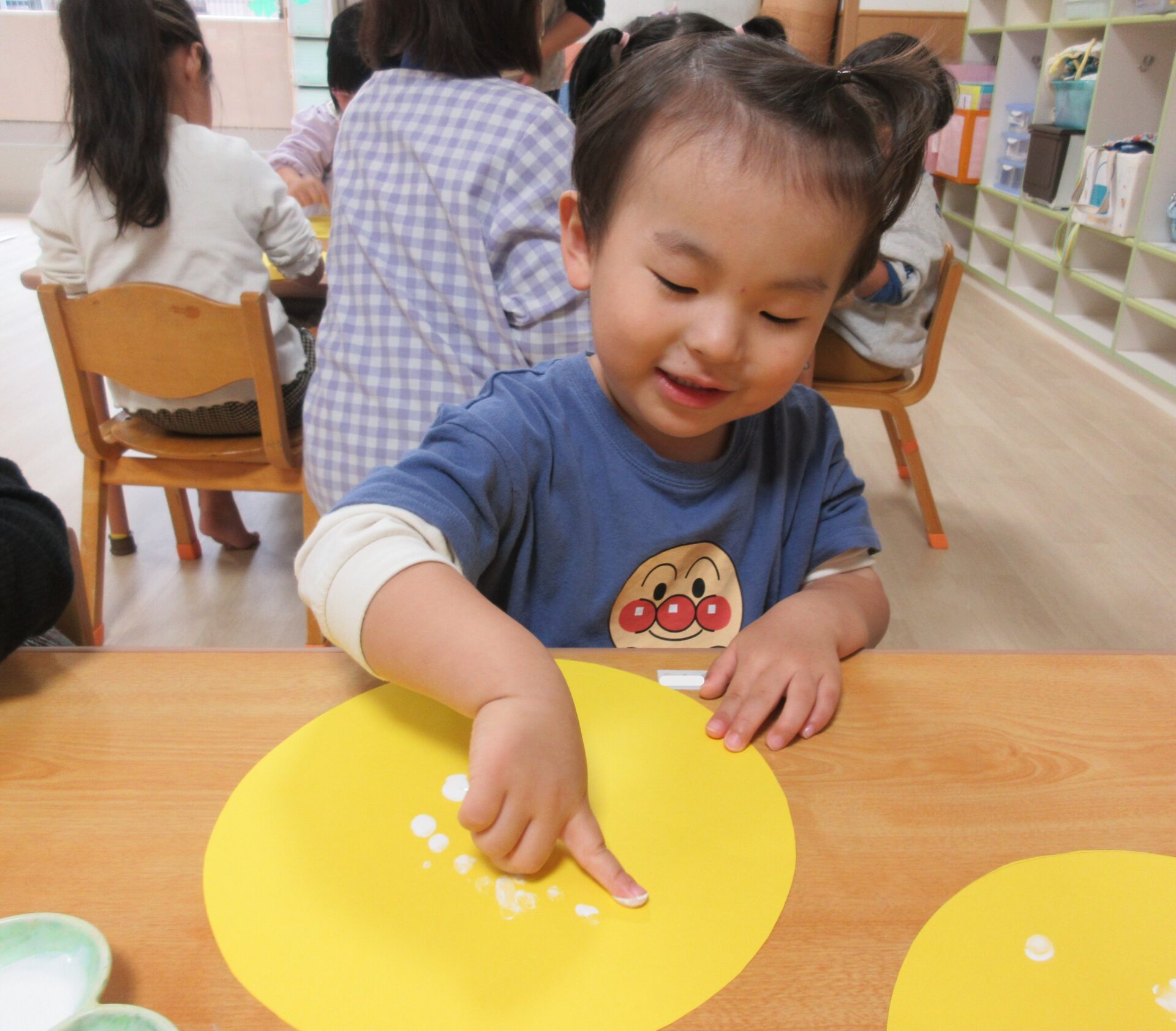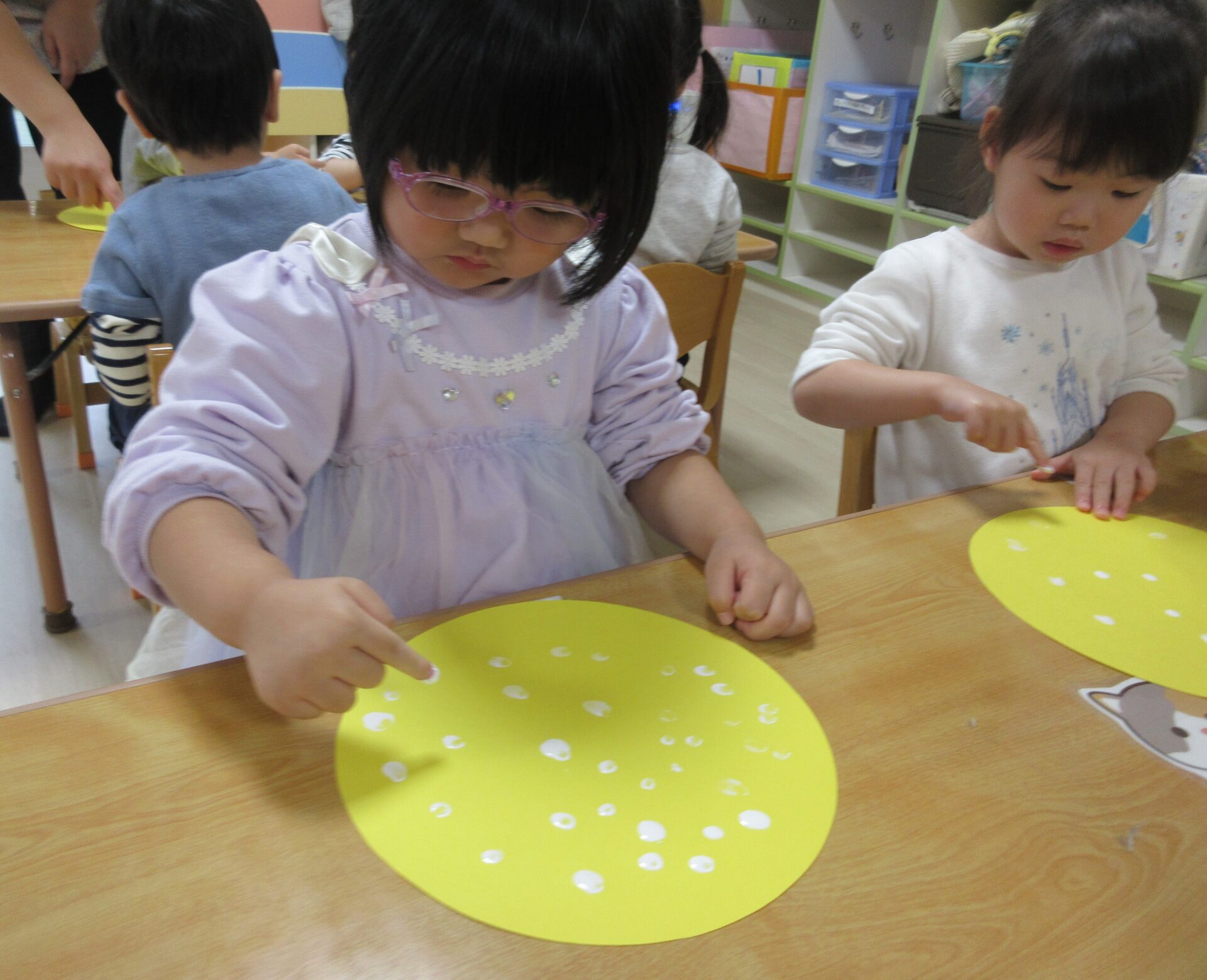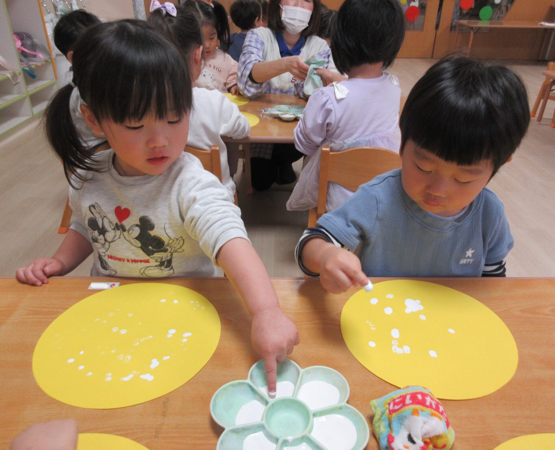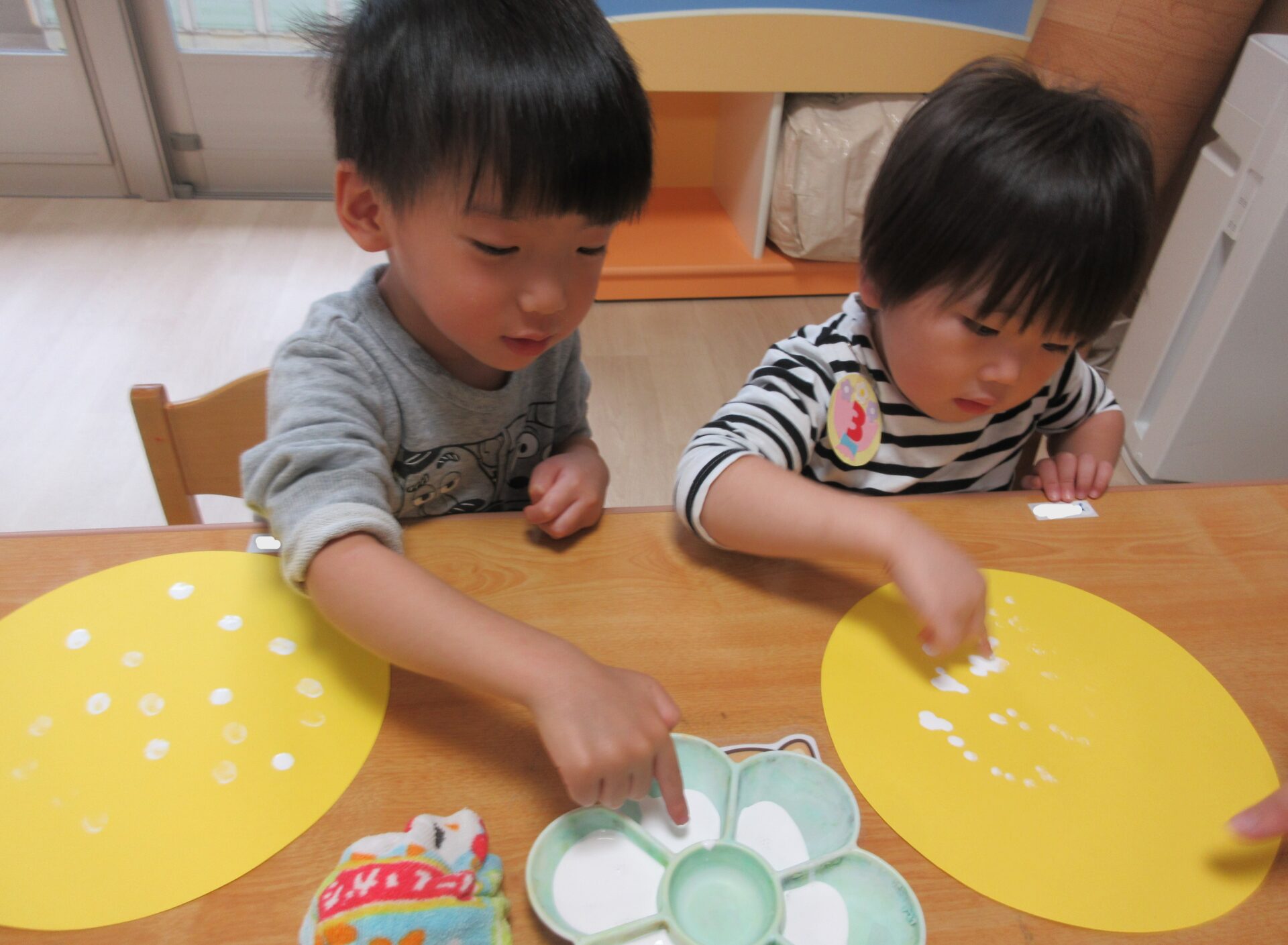 指に白い絵具を付けて「ポンポン」