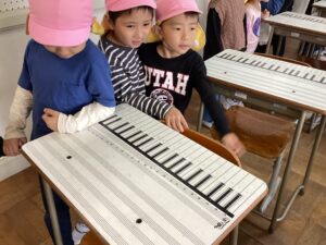 音楽室の机が鍵盤になってる!!!